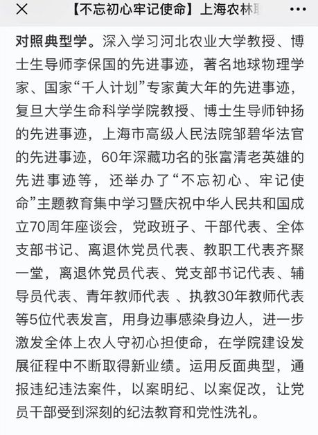 对照典型学。深入学习河北农业大学教授、博士生导师李保国的先进事迹,著名地球物理学家、国家“千人计划”专家黄大年的先进事迹,复旦大学生命科学学院教授、博士生导师钟扬的先进事迹,上海市高级人民法院邹碧华法官的先进事迹,60年深藏功名的张富清老英雄的先进事迹等,还举办了“不忘初心、牢记使命”主题教育集中学习暨庆祝中华人民共和国成立70周年座谈会,党政班子、干部代表、全体支部书记、离退休党员代表、教职工代表齐聚一堂,离退休党员代表、党支部书记代表、辅导员代表、青年教师代表 、执教30年教师代表等5位代表发言,用身边事感染身边人,进一步激发全体上农人守初心担使命,在学院建设发展征程中不断取得新业绩。运用反面典型,通报违纪违法案件,以案明纪、以案促改,让党员干部受到深刻的纪法教育和党性洗礼。