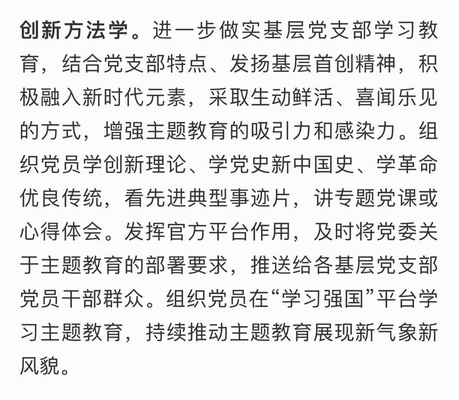 创新方法学。进一步做实基层党支部学习教育,结合党支部特点、发扬基层首创精神,积极融入新时代元素,采取生动鲜活、喜闻乐见的方式,增强主题教育的吸引力和感染力。组织党员学创新理论、学党史新中国史、学革命优良传统,看先进典型事迹片,讲专题党课或心得体会。发挥官方平台作用,及时将党委关于主题教育的部署要求,推送给各基层党支部党员干部群众。组织党员在“学习强国”平台学习主题教育,持续推动主题教育展现新气象新风貌。