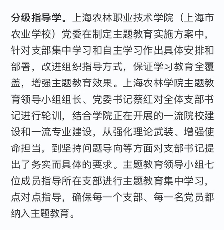 分级指导学。上海农林职业技术学院(上海市农业学校)党委在制定主题教育实施方案中,针对支部集中学习和自主学习作出具体安排和部署,改进组织指导方式,保证学习教育全覆盖,增强主题教育效果。上海农林学院主题教育领导小组组长、党委书记蔡红对全体支部书记进行轮训,结合学院正在开展的一流院校建设和一流专业建设,从强化理论武装、增强使命担当,到坚持问题导向等方面对支部书记提出了务实而具体的要求。主题教育领导小组七位成员指导所在支部进行主题教育集中学习,点对点指导,确保每一个支部、每一名党员都纳入主题教育。