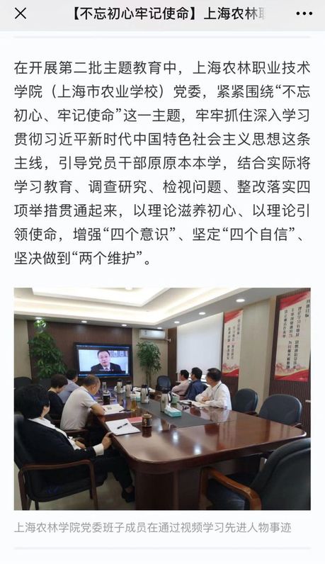 上海农林职业技术学院(上海市农业学校)党委采取集中学习和个人自学相结合的方式,深入学习习近平新时代中国特色社会主义思想,通过学习研讨、读书分享、观看视频、现场教学等形式开展理论学习。注重把理论学习成果转化到守初心、担使命、找差距、抓落实的主题教育总要求上来,牢记教育初心,不忘教育使命。并将进一步深化学习教育,坚持学习贯穿始终,切实把学习成效体现到增强党性、提高能力、改进作风、推动工作上来。