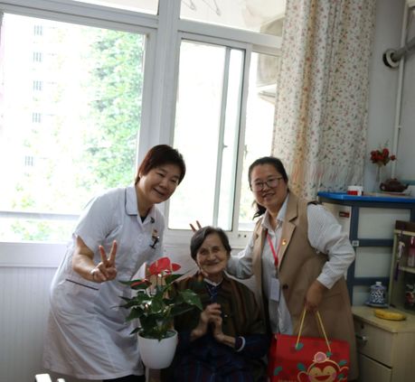 支部书记高东菊带着大家看望了结对的百岁老人王永珏,为她送去鲜花和慰问品,并送上节日问候和祝福。王奶奶虽然已经101岁高龄,交谈时思路无比清晰,老师和同学们惊讶之余,更对王奶奶由衷地敬佩。