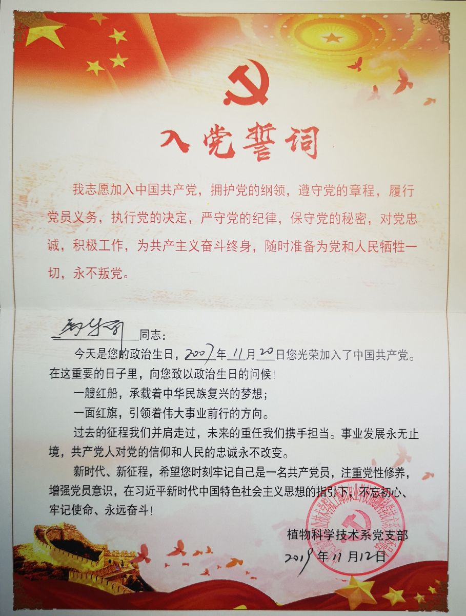 为加强党员理想信念教育,传递党组织的关心、希望和鞭策,植科系党支部自2019年1月开始以赠送支部精心设计制作的“政治生日贺卡”的形式为每位党员过政治生日。党员同志们纷纷表示,过“政治生日”活动,让大家再次回忆自己入党场景,是一次心灵的洗礼,让每一个党员同志铭记身上的神圣责任和使命。在以后的工作中,要进一步坚定理想信念,聚焦工作中的问题与困难,勇于担当,用实际行动践行入党誓词。